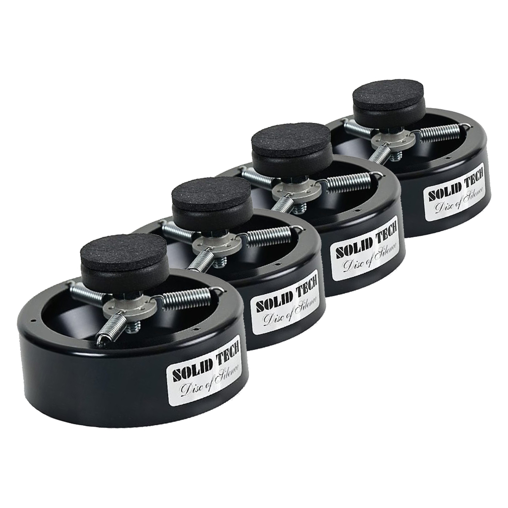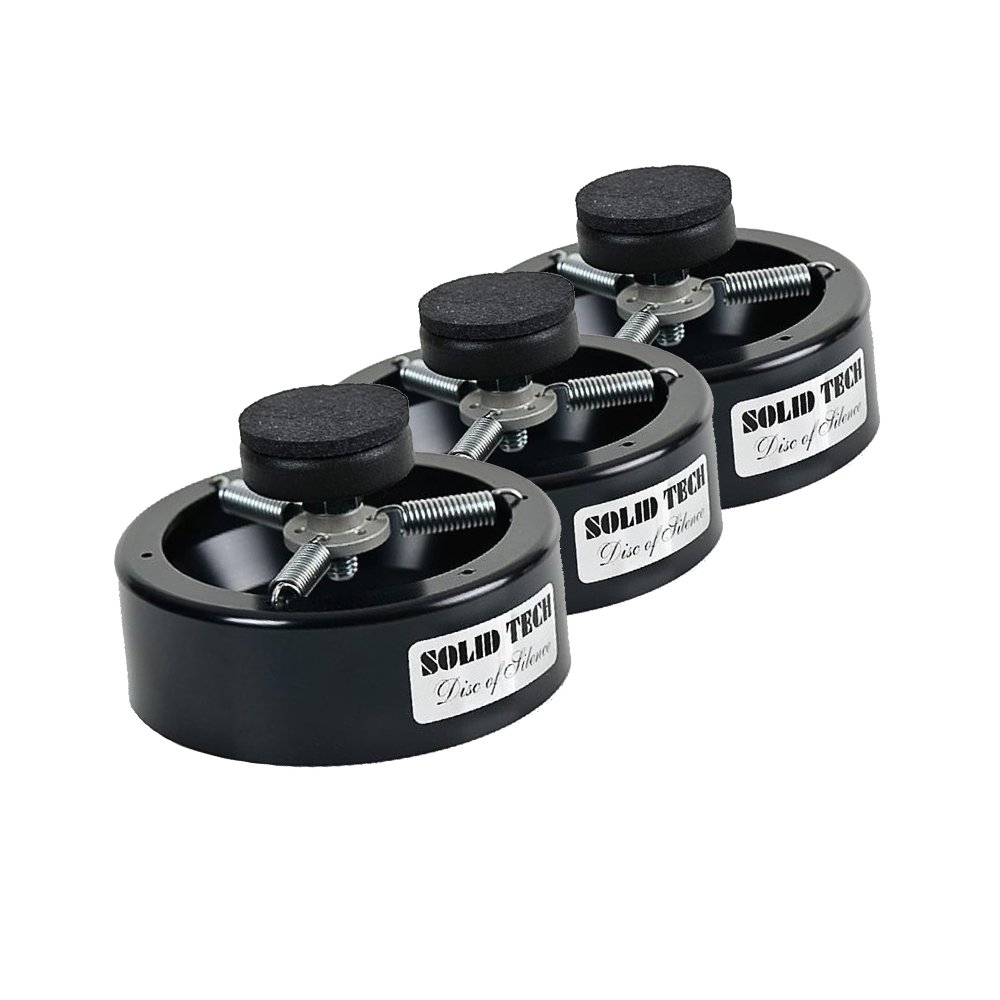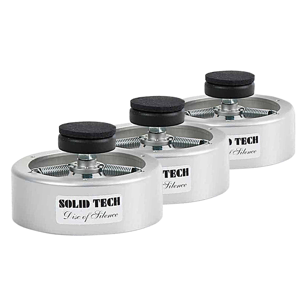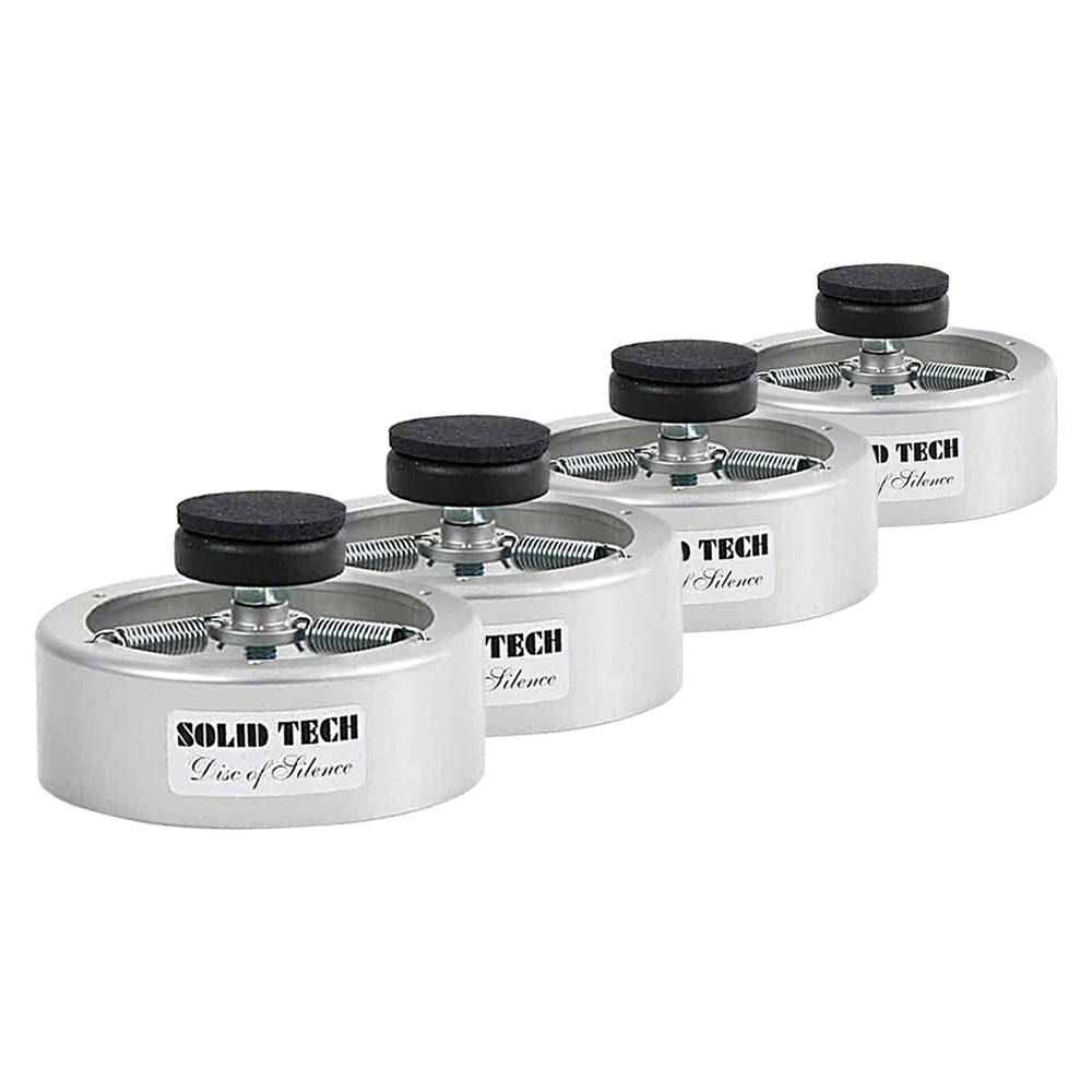 The Discs of Silence isolation-system consists of a cylindrically formed, sturdy and anodized Aluminum base, extension-springs, center-hub and a height-adjustable center-screw with a damping layer for mechanical coupling to the component.
